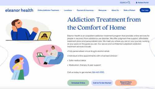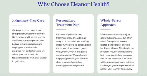 Eleanor Health delivers virtual addiction treatment that meets people where they are, on their terms and at their pace. Anyone struggling with opioid or alcohol addiction can access expert support from licensed medical providers, therapists, and peer recovery specialists without stepping into a clinic. The process is simple: it begins with a free, judgment-free call, followed by fast scheduling, often with a first appointment within 24 to 48 hours. Each treatment plan is personalized to match the individual’s goals, whether that means full abstinence or a harm-reduction approach.Virtual Care with Prescription DeliveryMembers receive practical tools and compassionate, human support that may include FDA-approved medications like Suboxone to ease cravings, virtual therapy to build healthy coping strategies, and online peer support from individuals with lived experience. Eleanor Health prescribes medications through licensed pharmacies, giving members the flexibility to either pick them up locally or have them delivered to their home when mail-order options are available.Peer Support from People Who Get ItPeer support is a core part of Eleanor Health’s care model. Individuals in recovery are connected with certified specialists who have walked similar paths through addiction or mental health struggles. These virtual sessions offer a safe, nonjudgmental space to share, reflect, and stay motivated.