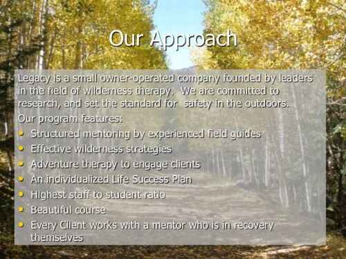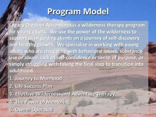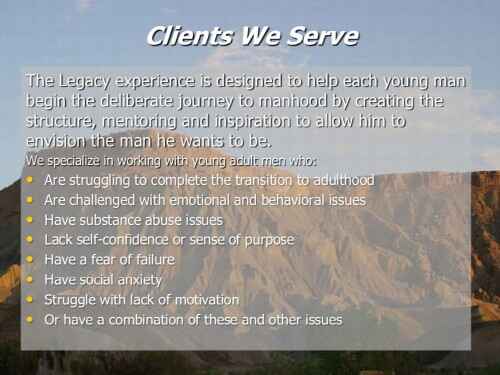Legacy Outdoor Adventures specializes in helping young men ages 18-35 make the successful transition to responsible adulthood. The Legacy team will work with your loved one to better understand the unique issues that are limiting his progression in life. Whether his challenges are related to substance abuse, addiction, fear of failure, social anxiety, lack of motivation, emotional/behavioral problems, or a combination of these and other issues the legacy experience will help him to overcome life’s obstacles and embrace manhood with a higher level of self-confidence and direction.